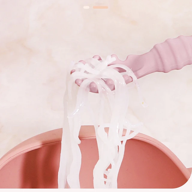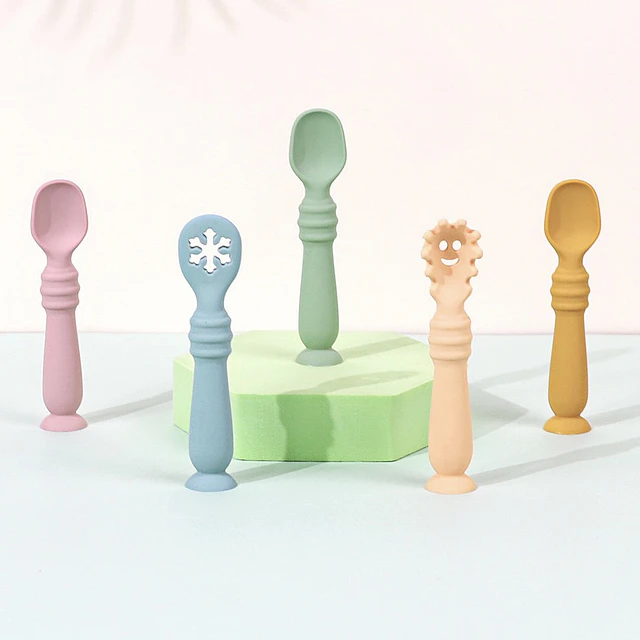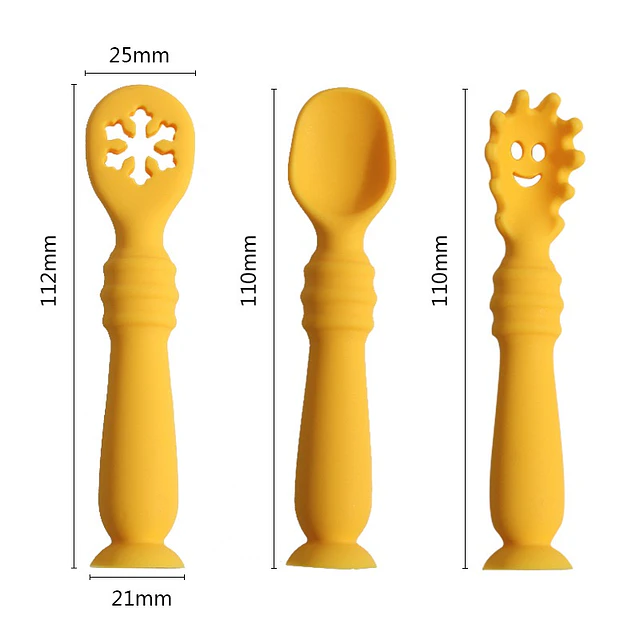 Innovador set de tres cubiertos de aprendizaje fabricados en silicona suave. Diseñados con mangos ergonómicos y cabezales texturizados para facilitar la autoalimentación según la densidad del alimento. Incorporan una base de succión para mantenerse en posición vertical.