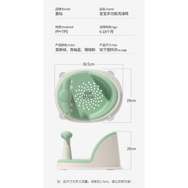 Práctica silla de baño diseñada para bebés que ya logran sentarse sin ayuda. Proporciona estabilidad y soporte durante el aseo gracias a su respaldo alto y su anclaje por succión. Ideal para usar en bañeras infantiles grandes o tinas de adulto.