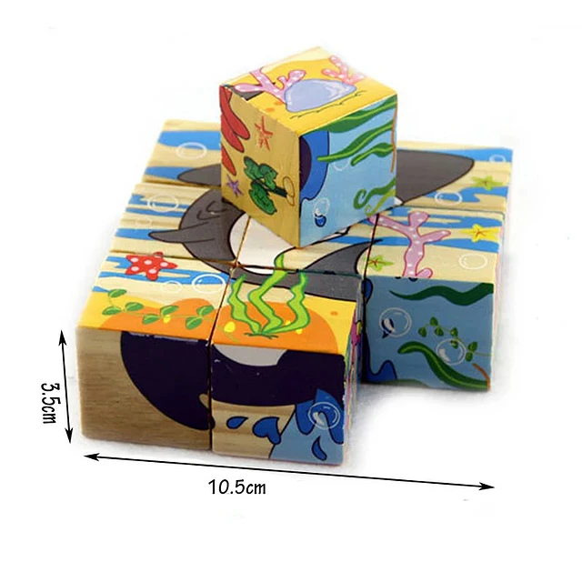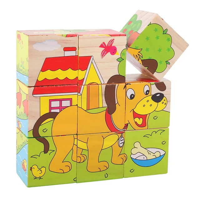 Práctico rompecabezas educativo compuesto por 9 cubos de madera. Al ir girando y acomodando las piezas, los niños pueden formar hasta 6 tiernas ilustraciones de animales diferentes. ¡Un regalo clásico y súper completo!