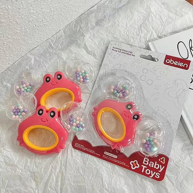 Colorido y súper entretenido. Este sonajero con forma de cangrejo tiene pinzas transparentes llenas de bolitas que suenan al agitarlo. Su agarre central facilita que el bebé lo sostenga solito, estimulando su coordinación motora y auditiva. ¡Un regalito hermoso y muy útil!