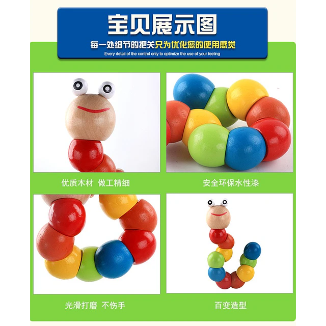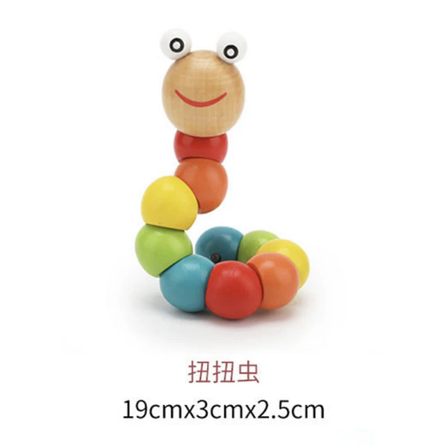Colorido juguete articulado de madera en forma de cuncuna. Sus segmentos esféricos están unidos por un resistente cordón elástico interno que permite doblarlo, girarlo y cambiarlo de posición. ¡Ideal para fortalecer la motricidad fina y aliviar el estrés en los más chiquitos!