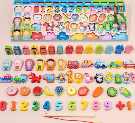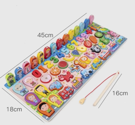 Cuenta con más de 60 piezas de madera con bordes suaves, pintura no tóxica y colores vibrantes. Tu bebé podrá explorar y clasificar números, animales, frutas, profesiones y mucho más. Además, ¡incluye un emocionante juego de pesca magnética con su propia caña para atrapar los pececitos!