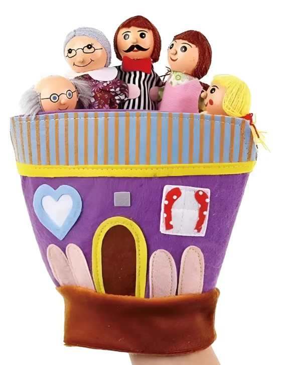 Divertido guante pedagógico con 5 títeres de dedo integrados. Ideal para estimular el lenguaje, la atención y el seguimiento visual en bebés y niños pequeños a través de cuentos y canciones.