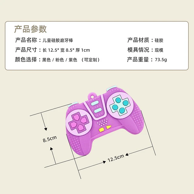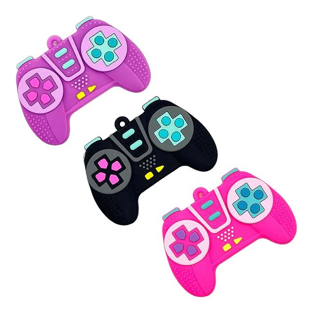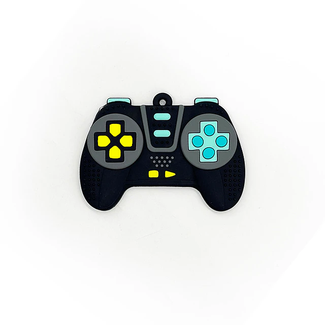 Divertido mordedor de silicona con diseño de mando de videojuegos. Cuenta con una superficie llena de texturas en relieve que imitan los botones reales, ideal para calmar la picazón de las encías durante la dentición. Su diseño de doble agarre facilita la manipulación por parte del bebé.