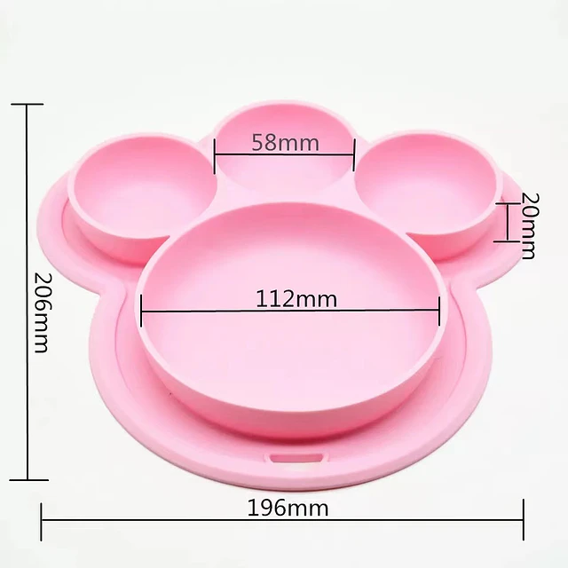 Práctico plato de silicona con base de succión diseñado para adherirse a la mesa y prevenir derrames. Sus múltiples compartimentos permiten separar las porciones de alimentos, fomentando una dieta equilibrada y la autoalimentación del bebé.